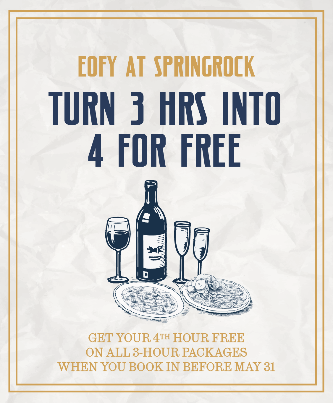 Book your EOFY function before 31 May and enjoy a little extra on us. Book a 3-hour beverage package and receive a complimentary fourth hour to keep the celebration going.EOFY doesn’t need to be complicated.